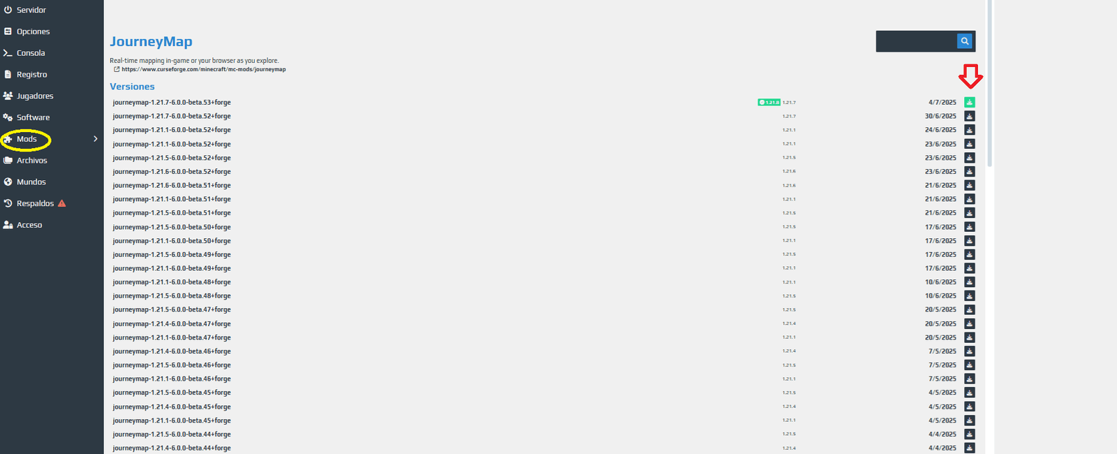 Una vez selecciones el mod deseado, debes descargar la versión que sea compatible con tu versión del server. Al igual que los plugins, normalmente viene en color verde, con lo cual no tendrás ningún problema en reconocerlo a simple vista.